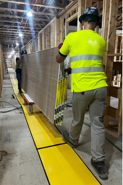 Hallway Hero is a high-impact jobsite floor reinforcement solution. Designed for length, long-term reusability, and durability, Hallway Hero is a perfect solution for when you're maneuvering heavy loaded carts in corridors with soft and brittle OSB floors.