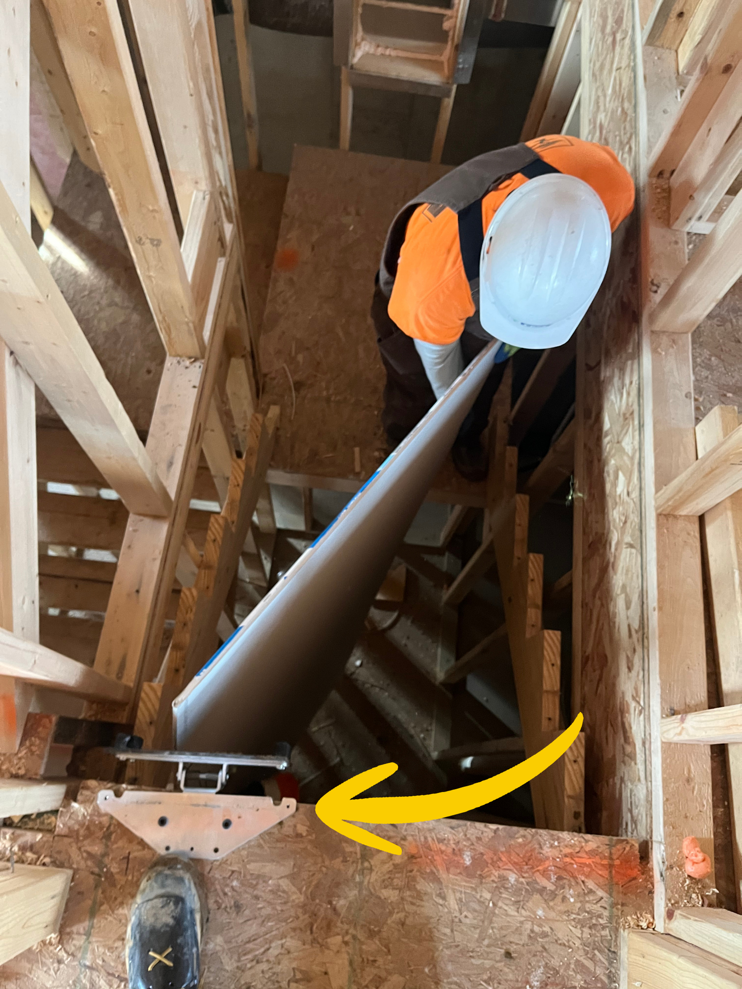 Tomahawk is a spring-return slide track for drywall delivery professionals. Useful for pulling drywall through a window, sliding down a stairwell, handing down/up through rough openings. The strong torsion spring deflects under load and snaps the guide back to your set vertical or horizontal position. The larger width and depth of the track provides for a better base for drywall and protects edges. The slim side-guards maximize contact surface, so the operators make fewer boom/fork adjustments per lift. Compatible with legacy tools.
